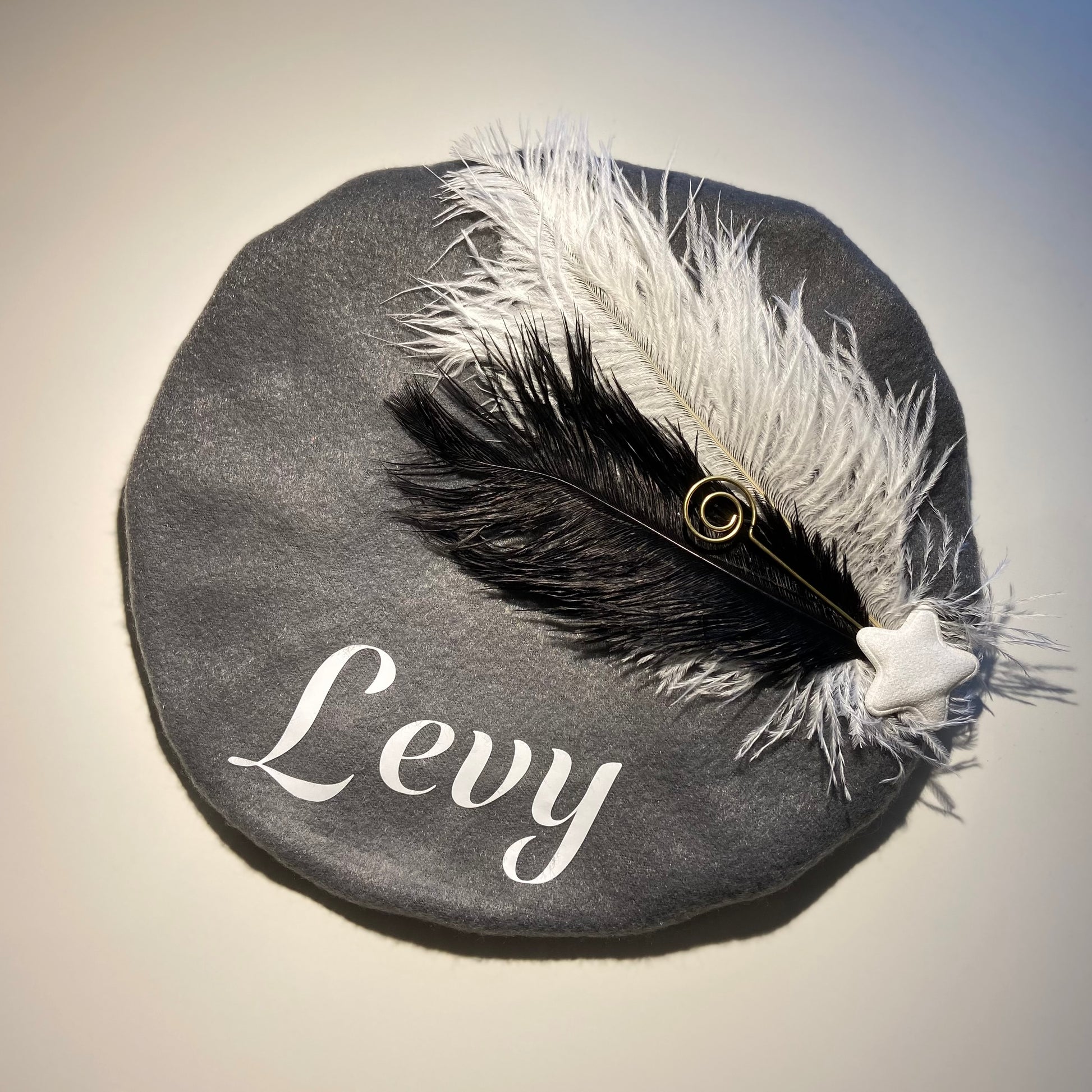 Op elke pietenmuts komen twee veren, een mini accessoire, een gouden stafje en de naam. Je hebt de keuze uit: